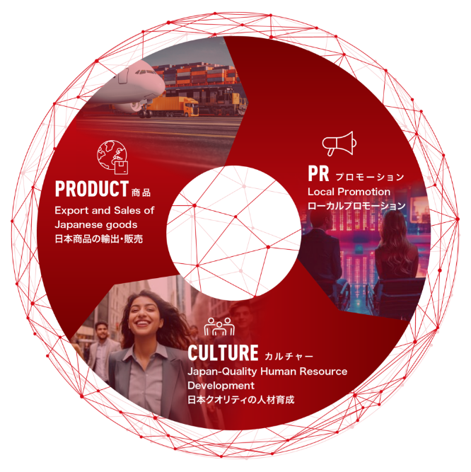 私達は日本の商品を海外のスーパーマーケットなどの小売店で展開し、現地でのプロモーションや販売手法の教育を通じて、日本品質に基づいた人材育成を行います。「商品」「PR」「カルチャー」の3つの軸を軸に、アメリカ・中国・香港・台湾以外の、国内企業がまだ進出していない国々を開拓し、最終的には世界の物流網の4分の3のシェアを獲得することを目指しています。