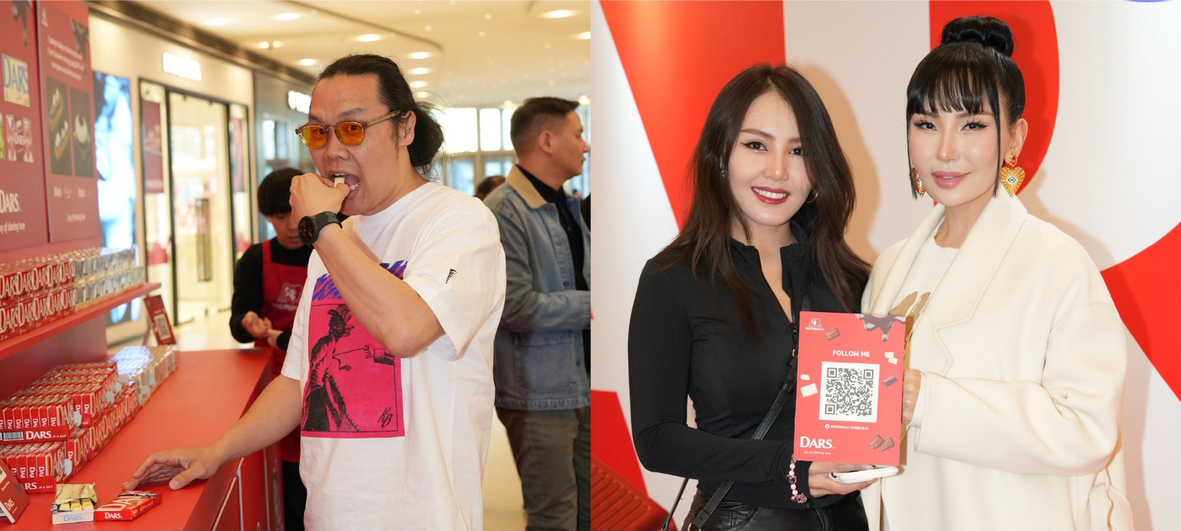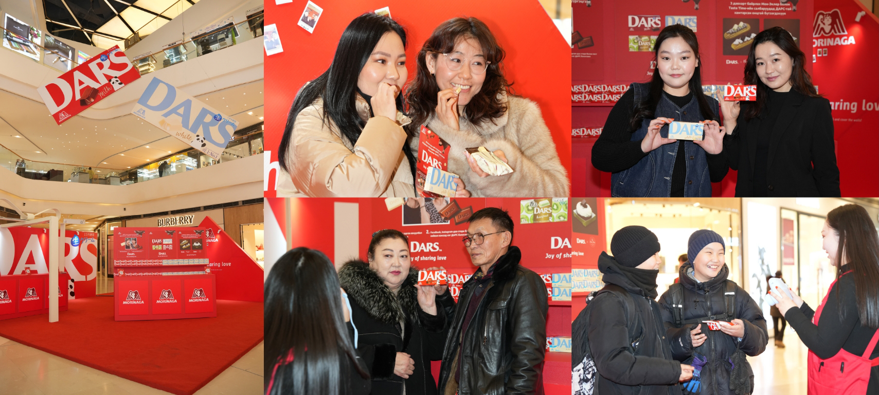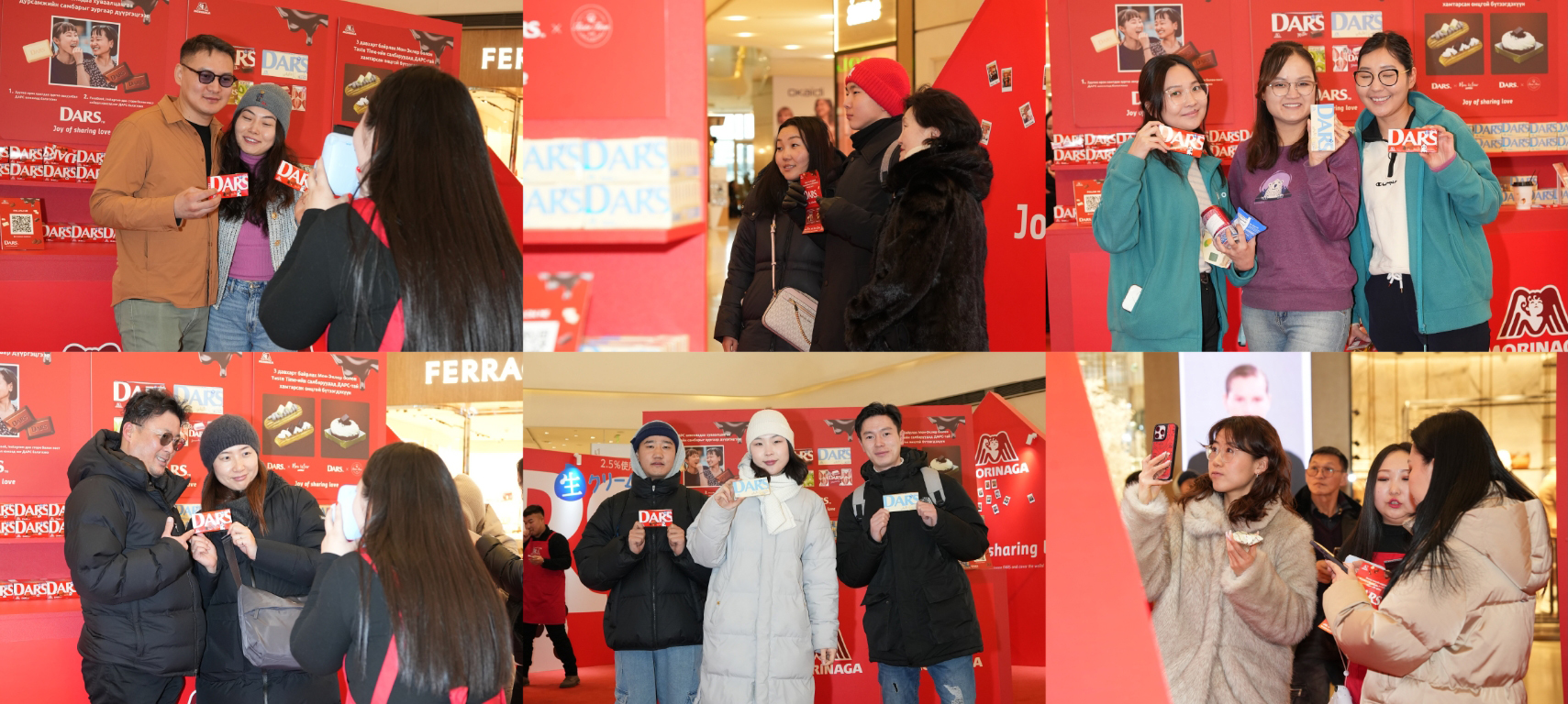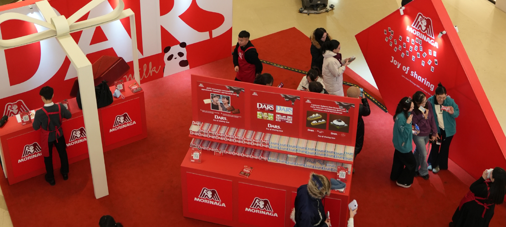 シャングリラモール内の特設会場にて、2人以上のグループを対象に森永DARSを1つプレゼントする企画を実施しました。さらに、「Joy of Sharing Love」のコンセプトのもと、DARSをシェアする様子をチェキで撮影し、会場内の装飾壁に掲示しました。予想を上回る来場者の参加により、DARS1,500個とチラシ1,000枚の配布は予定時間よりも早く完了。イベント終了後も、SNSの投稿を見て写真を撮りに来る来場者が多く、撮影自体は可能であることを案内しました。