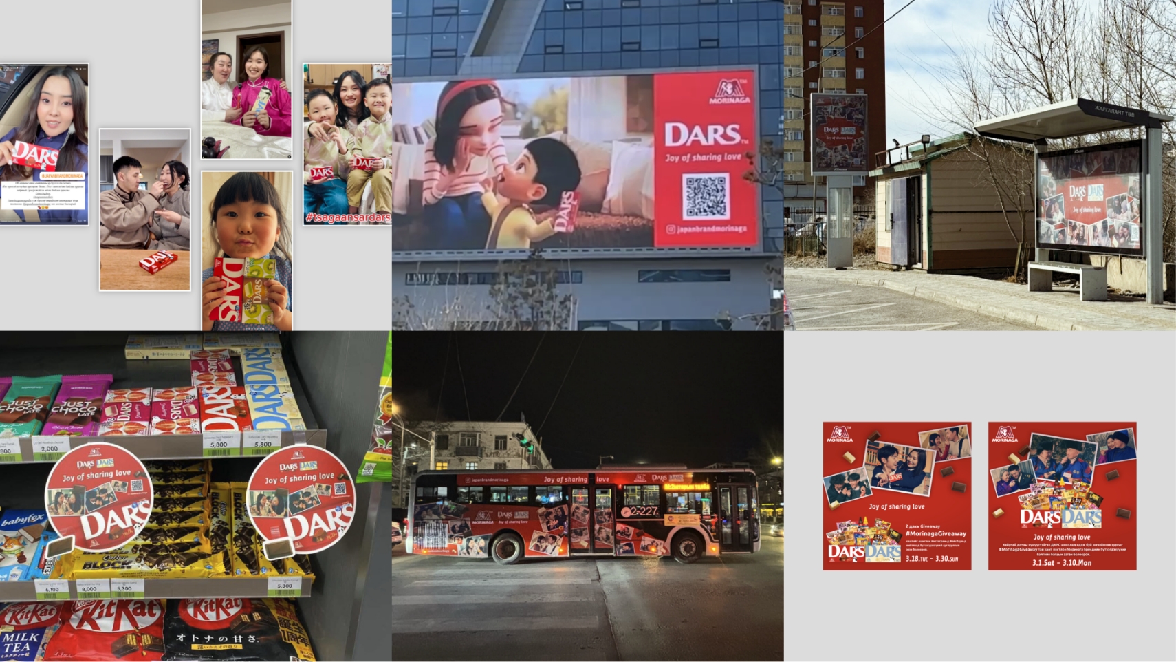 また、モンゴルでは日本のアニメーション文化が根強い人気を誇っており、言葉に頼らず“感覚で伝わる”表現が非常に効果的です。そこで私たちは、言語に依存しないアニメーション形式のTVCMを開発。ローンチのタイミングに合わせて、OOH広告やインフルエンサーによる発信を立体的に展開することで、まだ見ぬ日本ブランドである「DARS」の存在を、瞬く間に多くの生活者に届けることができました。